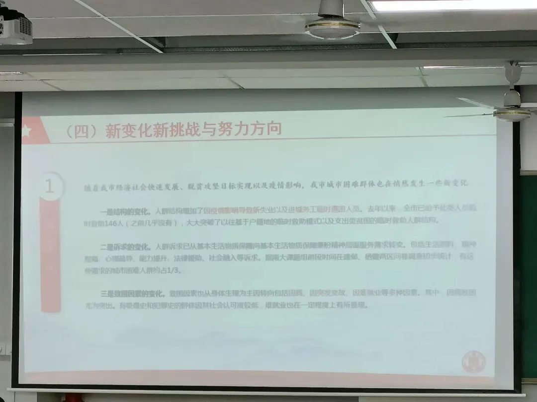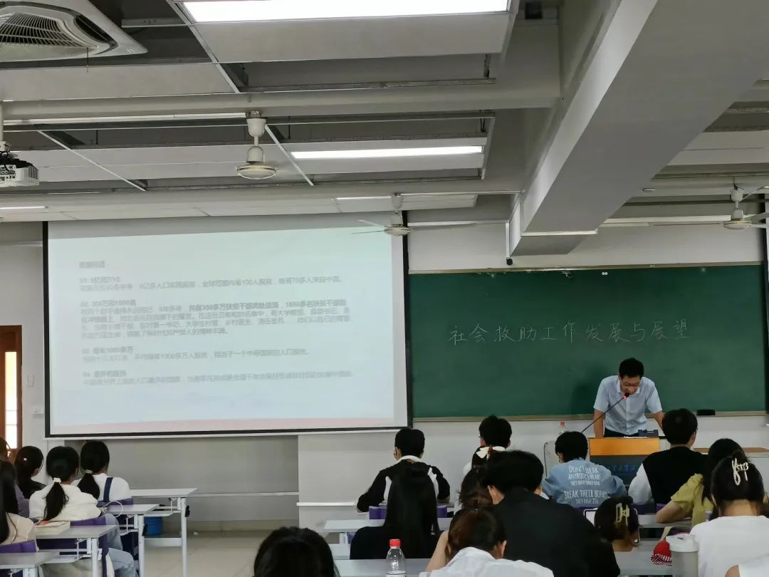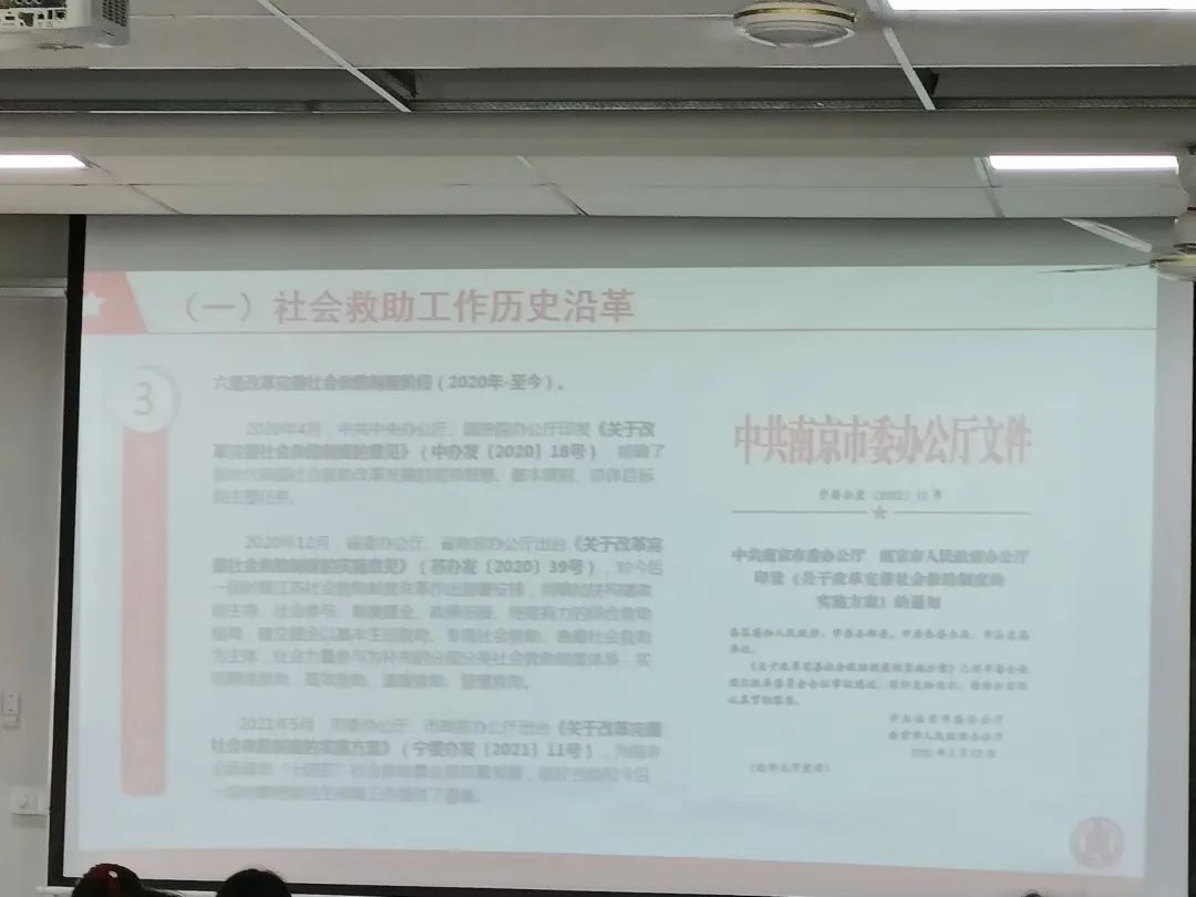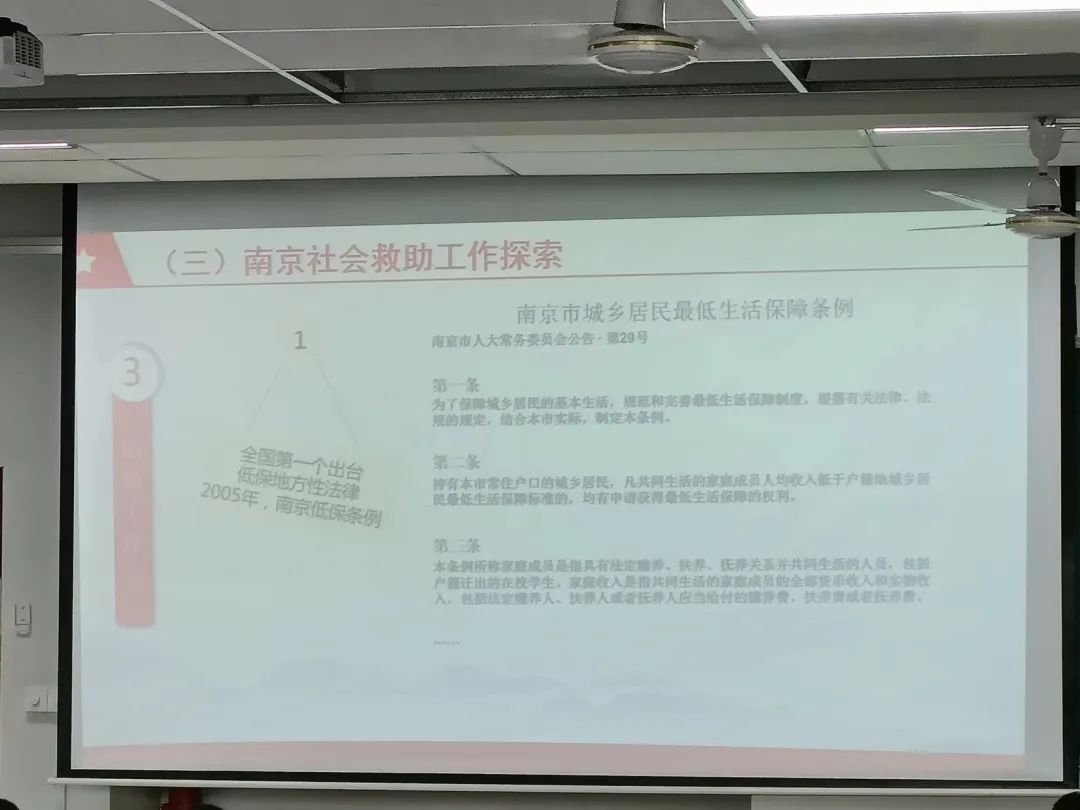 在講座過程中,徐貽珠老師還介紹了南京市在社會救助工作方面的總體數(shù)據(jù)情況,工作特點(diǎn)以及創(chuàng)新工作。向在座同學(xué)分享了南京在此方面所創(chuàng)造的榮譽(yù),提出了大數(shù)據(jù)預(yù)警是未來發(fā)展的重點(diǎn),但也提出了現(xiàn)今家庭困難程度評估的難題。同時,他提出:自2019年以來受新冠肺炎疫情影響,社會救助工作也出現(xiàn)了許多新變化、新挑戰(zhàn),我們未來的發(fā)展任重而道遠(yuǎn)。