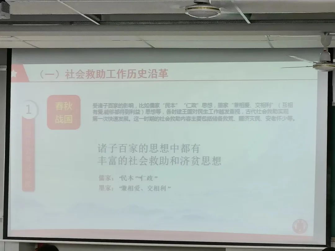 隨后,徐貽珠老師介紹了自春秋戰(zhàn)國時期到如今的國家建設(shè)社會救助的發(fā)展過程,加深了同學(xué)們對社會救助工作歷史沿革的了解,并由明清時期的社會救助工作提出了:民間社會力量救助工作是國家未來發(fā)展重點(diǎn)。由此引出了“8+1”的社會救助制度框架。