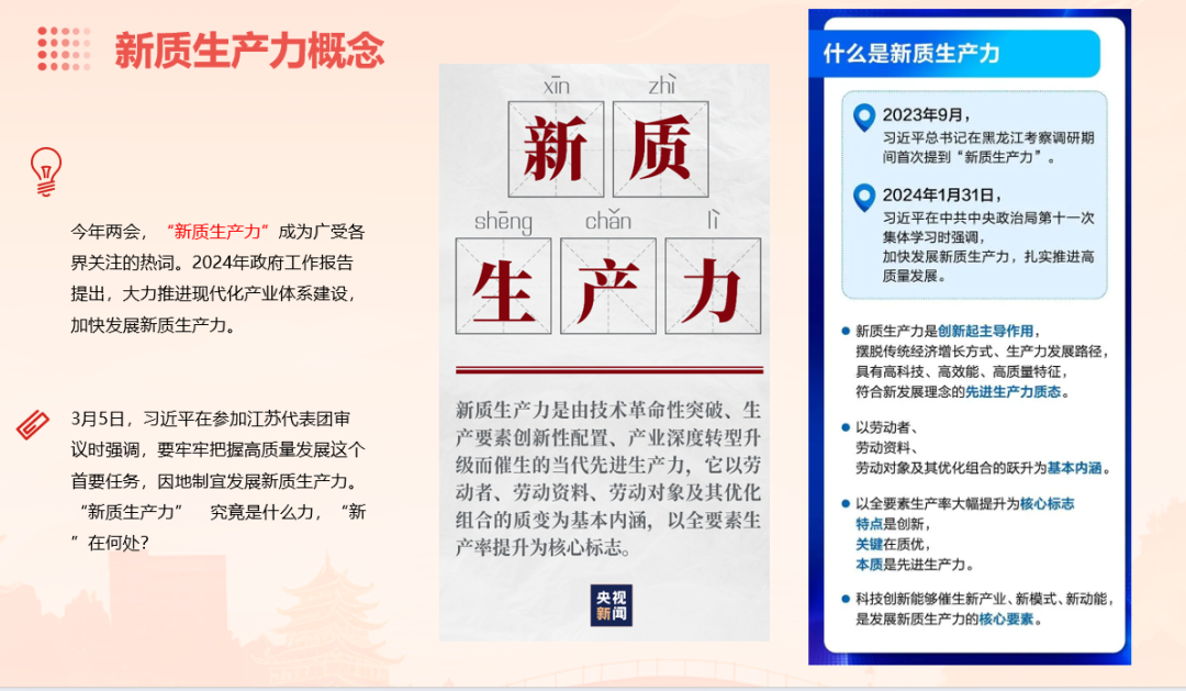 2024年政府工作報(bào)告提出,大力推進(jìn)現(xiàn)代化產(chǎn)業(yè)體系建設(shè),加快發(fā)展新質(zhì)生產(chǎn)力。遲英姿同志就這一工作報(bào)告,分享“新質(zhì)生產(chǎn)力”這一關(guān)鍵詞所蘊(yùn)含的內(nèi)容。