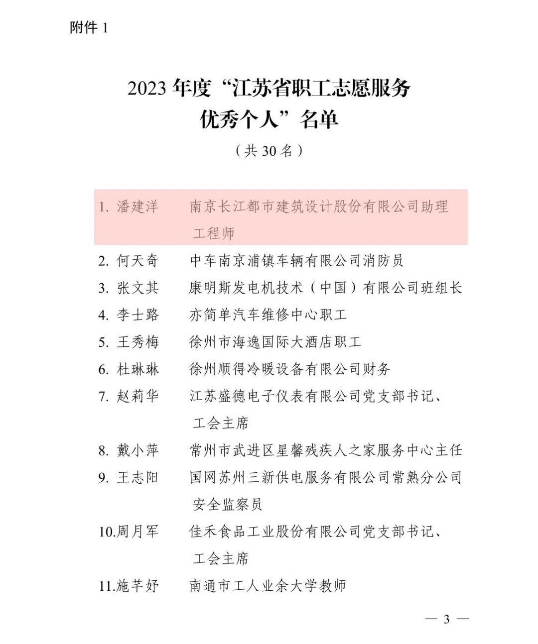 日前,為大力弘揚(yáng)“奉獻(xiàn)、友愛、互助、進(jìn)步”的志愿精神,江蘇省總工會通報(bào)了2023年度江蘇省職工志愿服務(wù)先進(jìn)典型,長江都市職工潘建洋入選2023年度“江蘇省職工志愿服務(wù)優(yōu)秀個人”名單,是全省30名職工志愿服務(wù)優(yōu)秀個人中唯一的設(shè)計(jì)師。為他點(diǎn)贊!