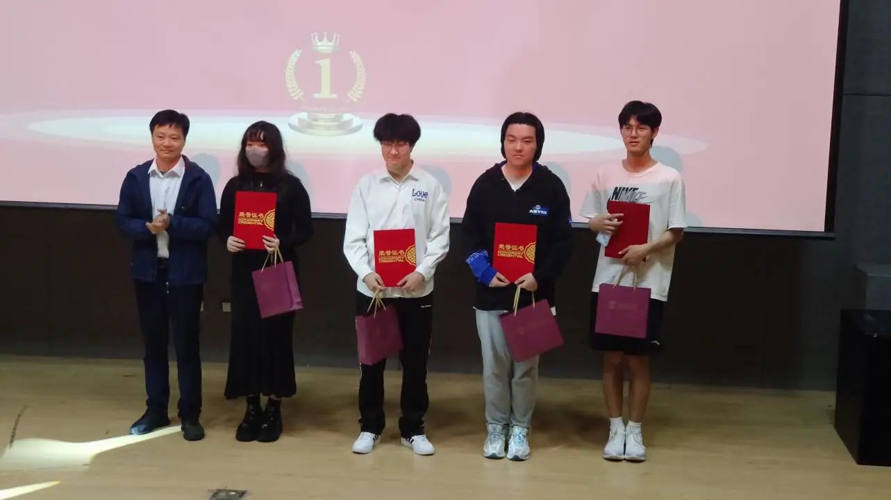 機(jī)電學(xué)院何杰老師為獲得優(yōu)秀獎(jiǎng)的陳果、趙睿燚、馮梓涵、郭津碩、孫贊韜頒獎(jiǎng)。