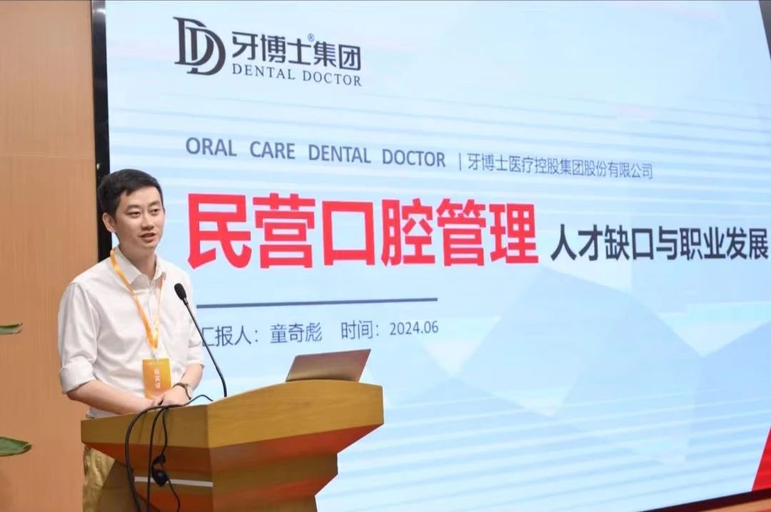 牙博士集團(tuán)人力資源中心總監(jiān)童奇彪從企業(yè)的角度作了《民營口腔管理人才缺口與職業(yè)發(fā)展》的主題報告,他提到,截止2023年,民營口腔醫(yī)療機(jī)構(gòu)數(shù)量已經(jīng)突破12萬家,幾乎每年都是以1-2萬家的速度在增長。按照單店30人的規(guī)模進(jìn)行測算,非醫(yī)護(hù)人員需求約達(dá)180萬人,該專業(yè)學(xué)生未來可進(jìn)入中大型民營口腔機(jī)構(gòu)從事人力、采購、經(jīng)營、品牌等諸多崗位的工作,就業(yè)前景廣闊。