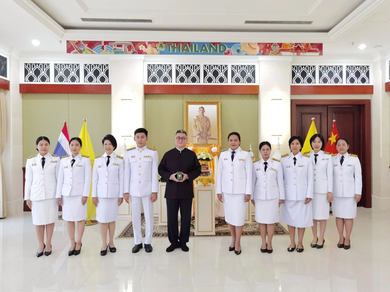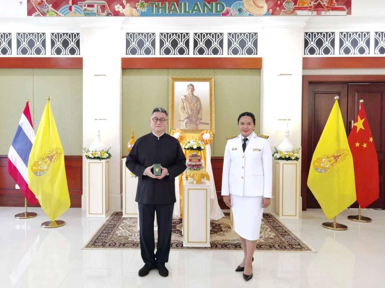 11月26日,泰王國(guó)駐廣州副總領(lǐng)事兼代總領(lǐng)事常佩瑤女士擔(dān)任泰國(guó)王室勛章授勛儀式的授勛人,為正大集團(tuán)副總裁、南京工業(yè)大學(xué)浦江學(xué)院理事長(zhǎng)、華商學(xué)研究院名譽(yù)院長(zhǎng)、原廣東省政府全球投資顧問(wèn)李聞海先生授勛。泰王國(guó)駐廣州商務(wù)處、農(nóng)業(yè)處、海關(guān)處、投資處、泰國(guó)國(guó)家旅游局廣州辦事處官員共同見(jiàn)證了上述儀式。