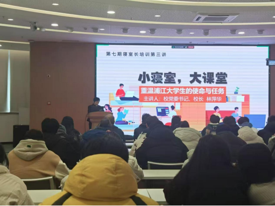 概要:12月25日下午,學校在圖書館多功能廳隆重舉辦了第七期寢室長培訓的第三講活動,旨在助力寢室長們明確角色定位,深化工作職責認知,并培養(yǎng)自我管理、主動實踐的意識和能力,進而引領寢室文化的繁榮發(fā)展。此次講座以“小寢室、大課堂:重溫浦江大學生的使命與任務”為主題,學校黨委書記、校長林萍華主講,校黨委委員、校長助理朱新娣主持,吸引了全校各學院寢室長代表共計200余名學子參與。