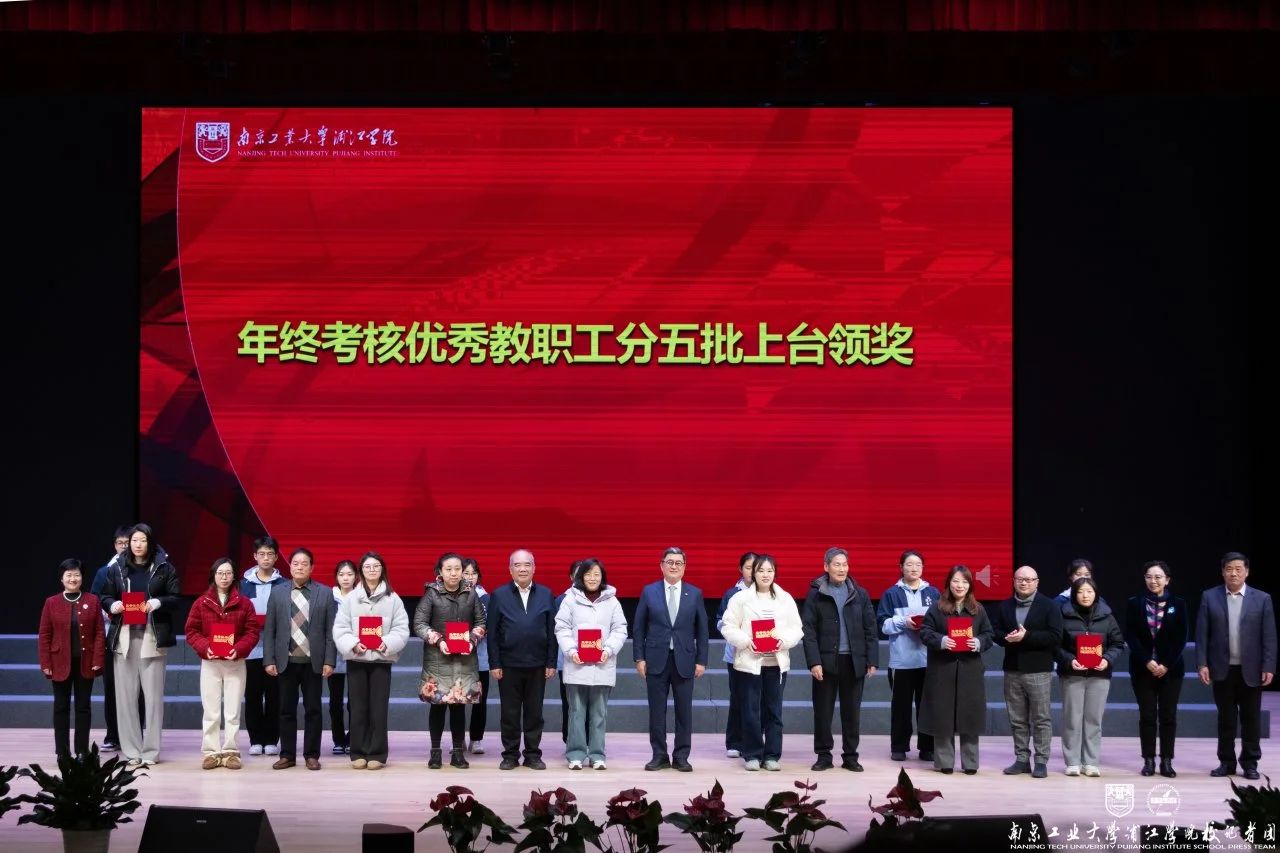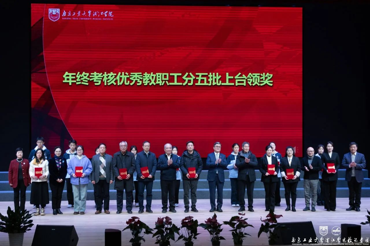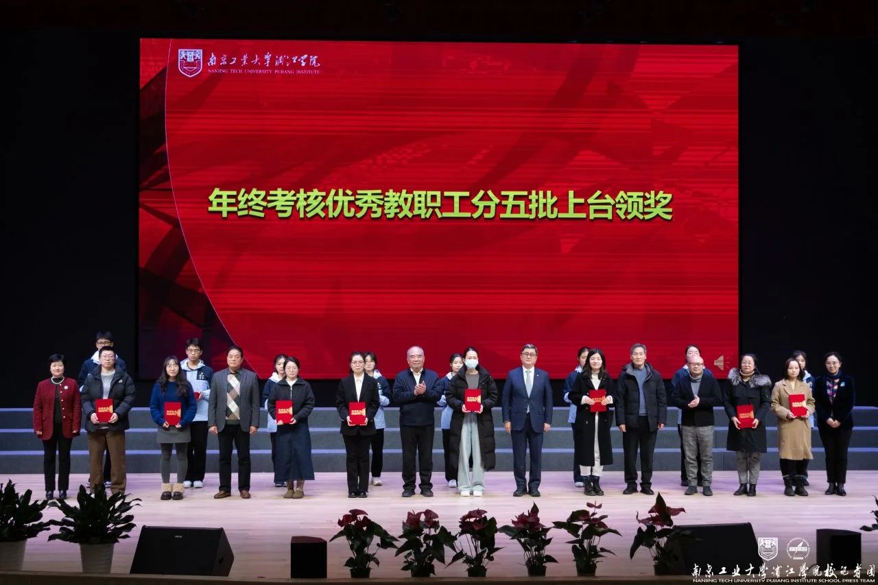 年終考核優(yōu)秀教職工分批上臺領獎,校領導頒獎。