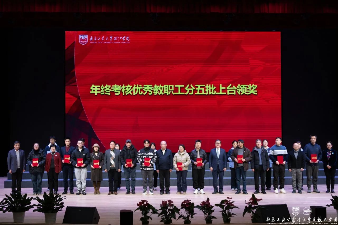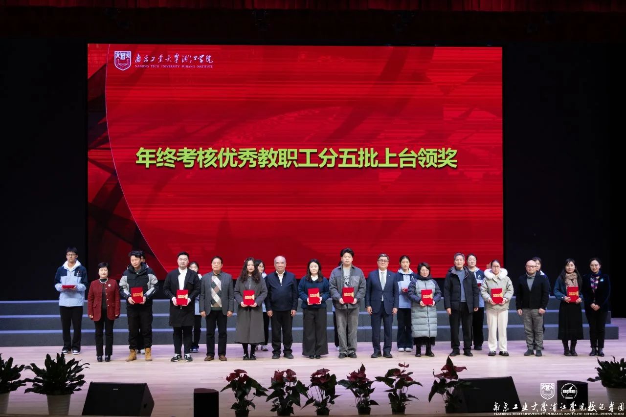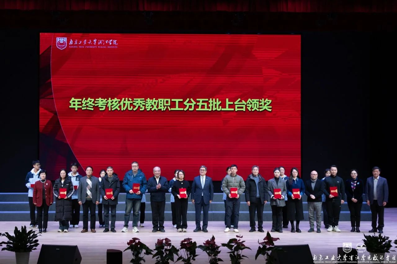 年終考核優(yōu)秀教職工分批上臺領獎,校領導頒獎。
