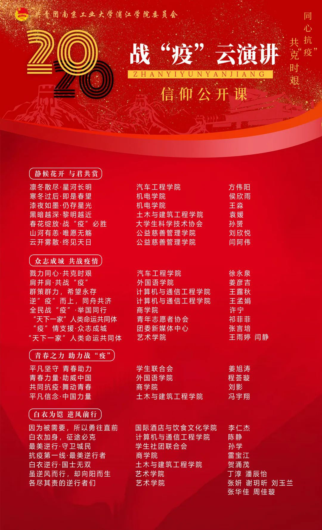 在抗疫防控的關(guān)鍵時期,校團委依托網(wǎng)絡(luò)全面開展“信仰公開課——戰(zhàn)‘疫’云講演”活動,構(gòu)建校、院、團支部三級聯(lián)動模式,切實推進“青年身邊的共青團”建設(shè),提升浦江青年的防疫意識與責(zé)任擔(dān)當(dāng)。